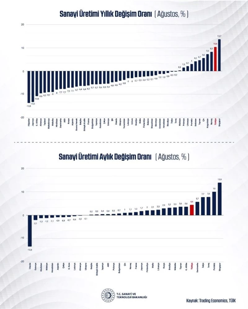 Sanayi ve Teknoloji Bakanı Mustafa Varank, sanayi üretimi konusunda Twitter hesabından yaptığı paylaşımda, "Ağustos sanayi üretimi yıllık yüzde 10,4 artarak, Ocak 2018’den bu yana en yüksek performansı yakaladı. Sanayide en hızlı toparlanan ülkelerden birisiyiz. İmalat sanayinde; siparişler, yatırım, üretim ve ihracat artıyor. Canlanma 3. çeyrekte istihdama ve büyümeye de yansıyacak" ifadelerine yer verdi.