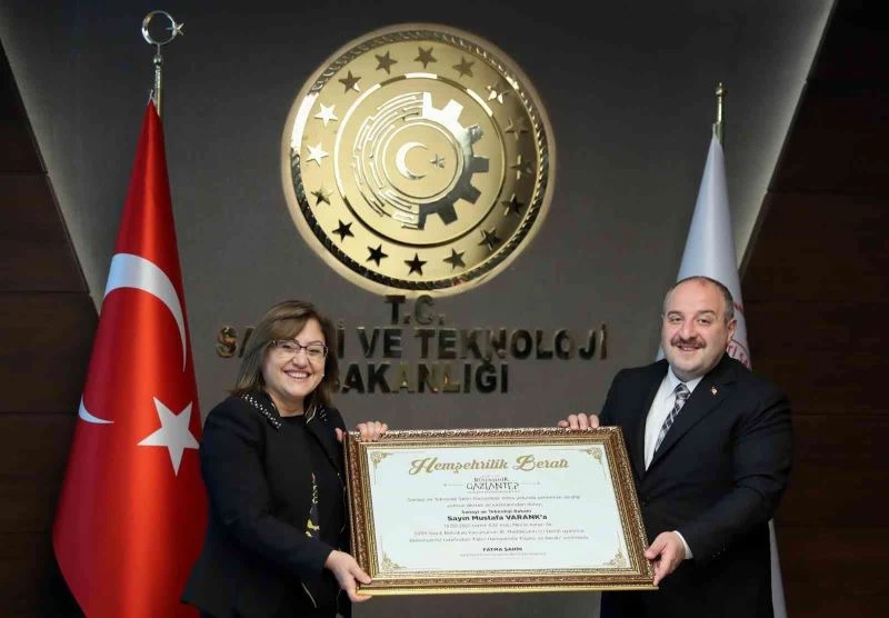 Gaziantep Büyükşehir Belediye Başkanı Fatma Şahin, sanayi ve teknoloji şehri Gaziantep’e verdiği destek ve katkılardan dolayı Sanayi ve Teknoloji Bakanı Mustafa Varank’a, Fahri Hemşehrilik Payesi ve Beratı verdi.