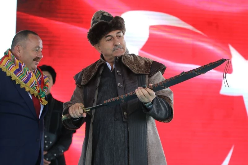 Konuşmasını tamamlayan Bakan Çavuşoğlu’na alp kıyafeti ve kılıç hediye edildi.