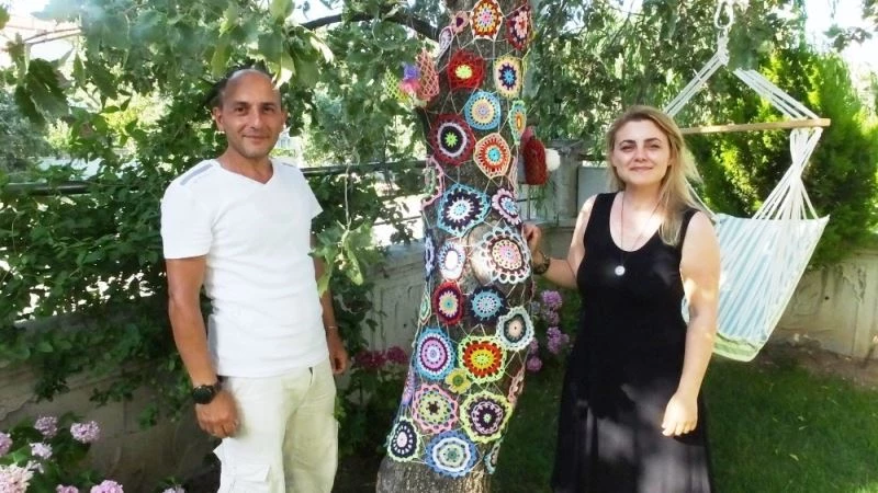 Balıkesir Burhaniye ilçesi Ören Mahallesi’nde oturan Kaan Tuna ve Dilek Tuna çifti, 2 yıl önce edindikleri evlerinin bahçesini çiçek ve ağaçlarla süslerken, bir meşe ağacı ile badem ağacının gövdesini de motiflerle süsledi. Gelin gibi süslenen ağaçlar da ilgi odağı oldu. Yoldan gelip geçen vatandaşlar süslenen ağaçlara tekrar tekrar bakarken, bazıları da hatıra fotoğrafı çektiriyor. Eve iki yıl önce taşındıklarını anlatan 2 çocuk annesi ev hanımı Dilek Tuna, “İki yıl önce bu eve geldik. Bahçemizi renklendirmek istedim. Motif yapmayı da çok seviyorum. Motiflerle ağaçları renklendirmek istedim. Ortaya da bu çıktı. Dışarıdaki ağacı da, kendime şal diye başlayıp sonra vazgeçtiğim motifleri de ağacı renklendirmek için kullandım. İnsanların ilgisini çekiyor. Resim çektiriyorlar. Bizim de hoşumuza gidiyor” dedi.