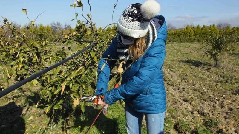 Balıkesir’de kınalı eller meyve ağaçlarında budama yaptı