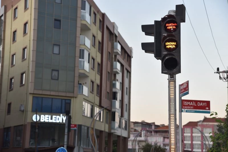 Balıkseir Dursunbey Belediyesi ilçe merkezinde bulunan trafik ışıklarına aşıların isimlerini yazarak farkındalık oluşturuyor.