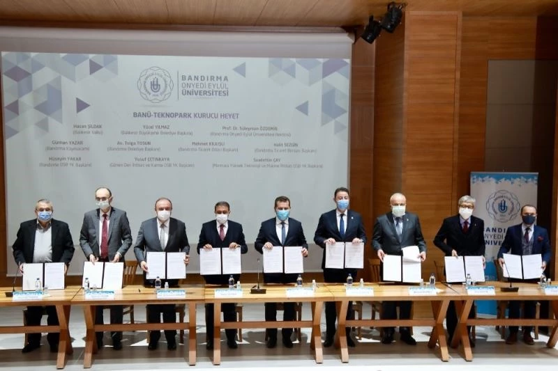 Daha sonra imza törenine geçildi. Balıkesir Valisi Hasan Şıldak, Balıkesir Büyükşehir Belediye Başkanı Yücel Yılmaz, Bandırma Onyedi Eylül Üniversitesi Rektörü Prof. Dr. Süleyman Özdemir, Bandırma Kaymakamı Günhan Yazar, Bandırma Belediye Başkanı Av. Tolga Tosun, Bandırma Ticaret Odası Başkanı Mehmet Kılkışlı, Bandırma Ticaret Borsası Başkanı Halit Sezgin, Gönen Deri İhtisas ve Karma OSB YK Başkanı Yusuf Çetinkaya, Marmara Yüksek Teknoloji ve Makine İhtisas OSB YK Başkanı Saadettin Çay’dan oluşan kurucu heyet, protokol metnine imza attı. Bandırma OSB adına Kurucu Heyette yer alan Hüseyin Yakar ise mazereti nedeniyle imza törenine katılamadı. Atılan imzalar ile BANÜ-TEKNOPARK’ın kuruluşunda ilk adım atılmış oldu.