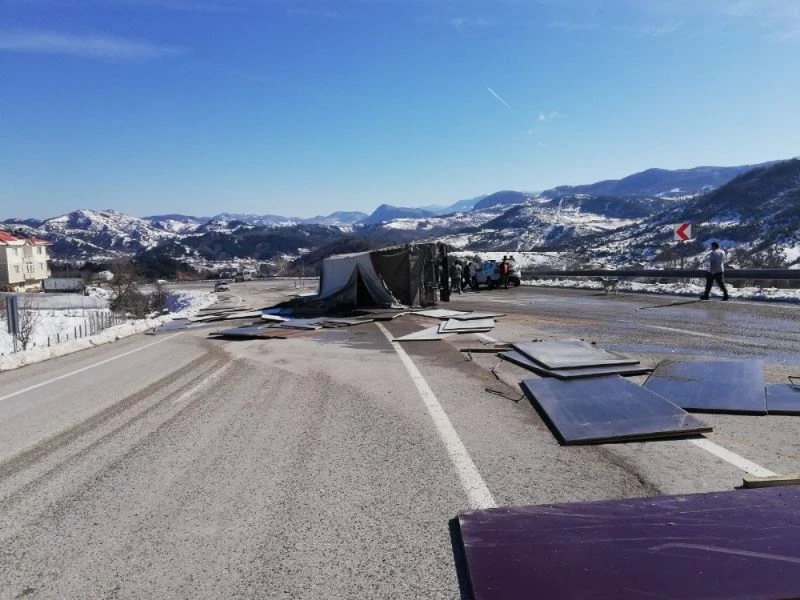 Bartın Kurucaşile karayolunda freni patlayan MDF yüklü kamyon devrildi.