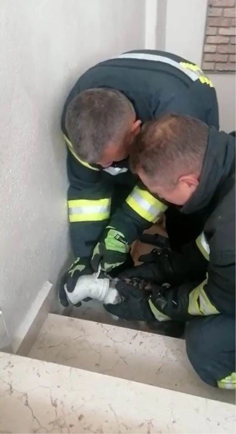 Başı plastik boruya sıkışan kediyi itfaiye erleri kurtardı