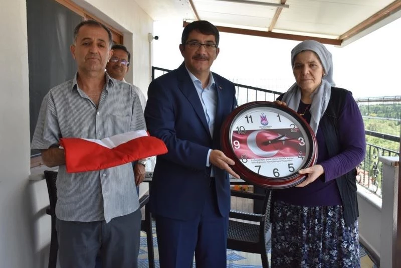 Şehit Komiser Ali Osman Sarıçalı’nın ruhuna Kur’an okunup duaların edildiği ziyarette Başkan Çelik şehit babası Mehmet Sarıçalı’ya ziyaretinin anısına şanlı Türk bayrağı ve şehitleri simgeleyen bir saat hediye etti.
