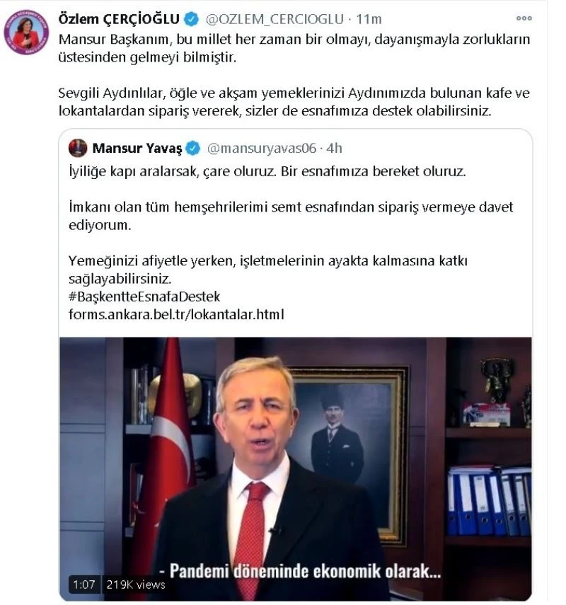 Ankara Büyükşehir Belediye Başkanı Mansur Yavaş, sosyal medya üzerinden “İyiliğe kapı aralarsak, çare oluruz. Bir esnafımıza bereket oluruz. İmkanı olan tüm hemşehrilerimi semt esnafından sipariş vermeye davet ediyorum. Yemeğinizi afiyetle yerken, işletmelerinin ayakta kalmasına katkı sağlayabilirsiniz” paylaşımında bulundu. Bu paylaşımın ardından Aydın Büyükşehir Belediye Başkanı Özlem Çerçioğlu’da sosyal medya aracılığıyla Aydınlılara seslenerek, “Mansur Başkanım, bu millet her zaman bir olmayı, dayanışmayla zorlukların üstesinden gelmeyi bilmiştir. Sevgili Aydınlılar, öğle ve akşam yemeklerinizi Aydınımızda bulunan kafe ve lokantalardan sipariş vererek, sizler de esnafımıza destek olabilirsiniz” dedi.