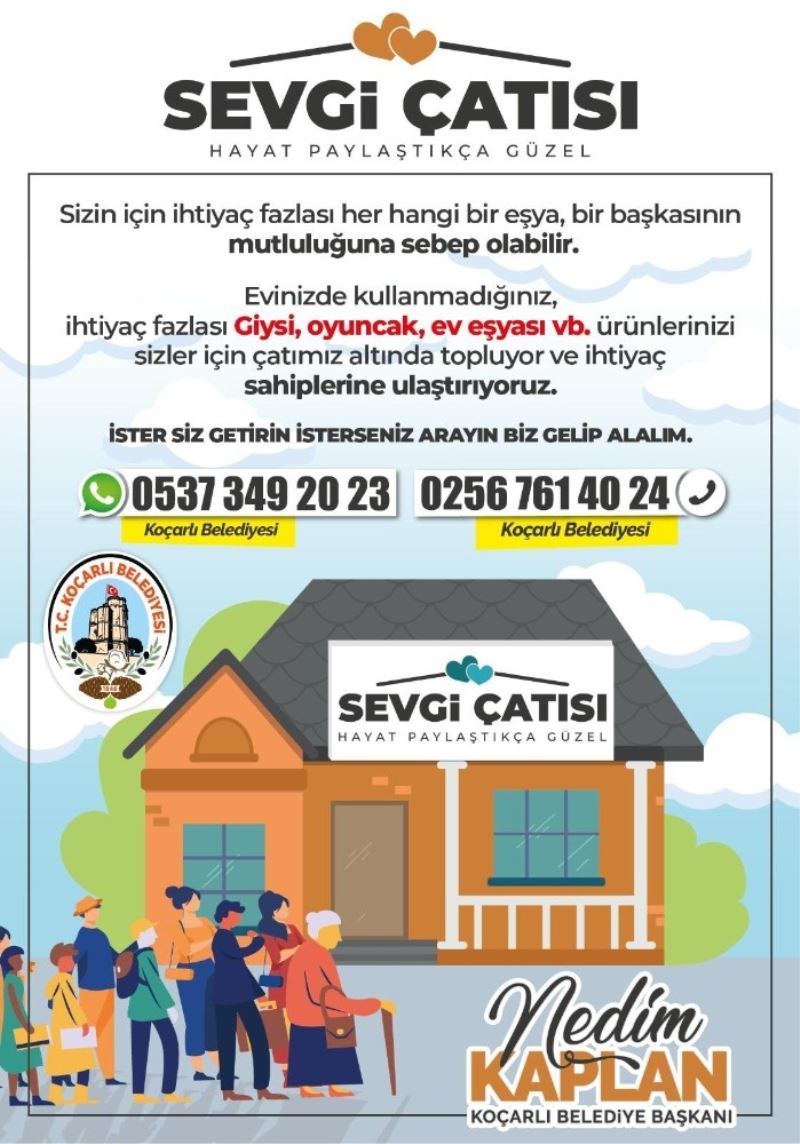Kaplan’ın ’Hayat paylaştıkça güzel’ sloganıyla kurduğu ’Sevgi Çatısı’ merkezinde vatandaşların kullanımına ihtiyaç duymadığı giysi, ev eşyası, oyuncak gibi ürünleri bu merkezde toplayıp ihtiyaç sahiplerine ulaştırılacak.