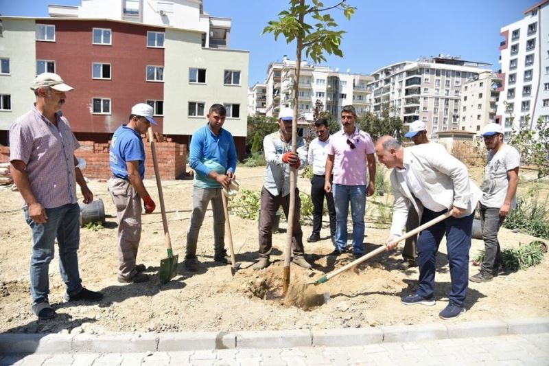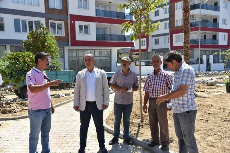 İncirliova Belediye Başkanı Aytekin Kaya, Sandıklı Mahallesi’nde yapımı süren park alanında incelemelerde bulunarak fidan dikti.