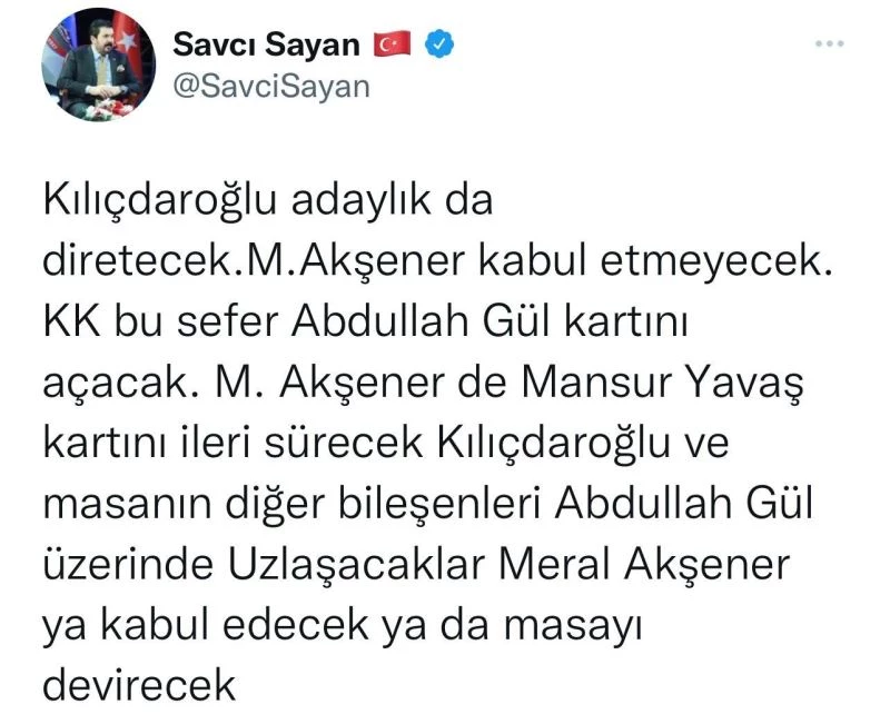 “Kılıçdaroğlu adaylık da diretecek. Meral Akşener kabul etmeyecek. Kemal Kılıçdaroğlu bu sefer Abdullah Gül kartını açacak. Meral Akşener’de, Mansur Yavaş kartını ileri sürecek Kılıçdaroğlu ve masanın diğer bileşenleri Abdullah Gül üzerinde uzlaşacaklar Meral Akşener ya kabul edecek ya da masayı devirecek”