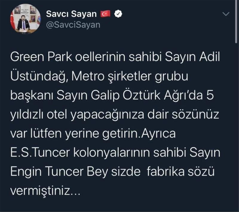 “Green Park otellerinin sahibi sayın Adil Üstündağ, Metro Şirketler Grubu Başkanı sayın Galip Öztürk Ağrı’da 5 yıldızlı otel yapacağınıza dair sözünüz var, lütfen yerine getirin. Ayrıca Eyüp Sabri Tuncer kolonyalarının sahibi sayın Engin Tuncer bey siz de fabrika sözü vermiştiniz”