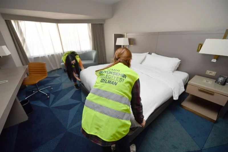 Geçici olarak çadırda barınan depremzedeler için eski Hilton Oteli’nin binasındaki son hazırlıklar da tamamlandı. Otel odalarında ilaçlama ve dezenfeksiyon işlemleri yapıldı, odalar temizlendi. 12 ve 30’uncu katlar dahil olmak üzere toplam 19 kata yerleştirilecek depremzedeler için tüm odalara ihtiyaç duyulabilecek hijyen malzemeleri yerleştirildi. Binaya dört çamaşır ve dört kurutma makinesinin olduğu bir çamaşırhane de kuruluyor. İzmir Büyükşehir Belediyesi, üç ay boyunca otel binasında kalacak depremzedeler için aşevinden günde üç öğün yemek servisi yapacak. Otel girişinde ise görevli personelin olacağı bir karşılama alanı ve çay-kahve servisi için ayrı bir bölüm oluşturuldu. 31 Ocak tarihine kadar büyükşehir belediyesi personeli de depremzedelerin ihtiyaçları ve güvenliği için otelde bulunacak. Binada kalacak depremzedelerin maske, eldiven ve dezenfektan ihtiyacını da İzmir Büyükşehir Belediyesi karşılayacak. Odalara ziyaretçi kabul edilmeyecek. Binaya girenlerin ateşi ölçülecek, binada doktor ve sağlık personeli de bulundurulacak.