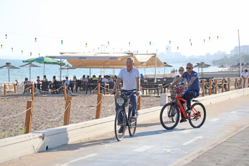 Mezitli Belediye Başkanı Neşet Tarhan, Mezitli’de bisikletle sahil turu yaparak denize giren vatandaşlarla sohbet etti. Pompeiopolis Parkı içerisinde oluşturulan Aile Plajına kadar sahil boyunca bisiklet süren Başkan Tarhan, burada plajın kullanımıyla ilgili görevlilerden bilgi aldı.