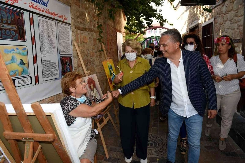Belediye Başkanı Uysal da eşi Ümran Uysal’la birlikte festival sokaklarını ziyaret etti, sanatçılarla, yazarlarla bir araya geldi. Başkan Uysal’ın ilk adresi, resim çalışmalarını vefat ettiği 2016 yılına kadar Kaleiçi’nde sürdüren ressam Muhittin Selamet anısına ‘Kaleiçi Seninle Güzeldir’ başlığı altında çalıştayın yapıldığı Kandiller Sokak oldu. Küratörlüğünü Doç. Dr. Terlan Mehdiyeva Azizzade’nin yaptığı çalıştayda, Başkan Uysal ve eşi, tuvallerin başında sokakta resim yapan sanatçılarla sohbet etti.