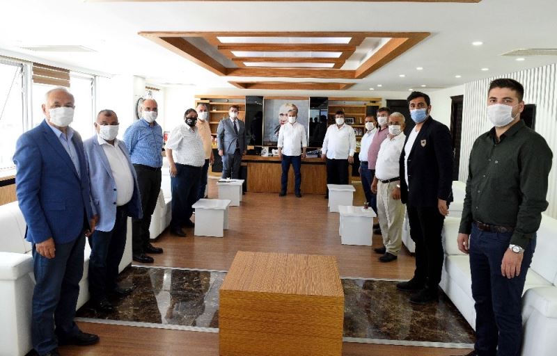 AESOB Başkanı Dere, korona virüs salgının en üst düzeyde devam ettiği günlerde, esnafa maske ve işyerlerinin dezenfeksiyonu konusunda verdiği destek dolayasıyla Başkan Ümit Uysal’a teşekkür ziyaretinde bulundu. Ziyarette Başkanvekilleri Bayram Dal, Mehmet Ali Gülaçtı, Genel Sekreter Mehmet Işıldağ, Yönetim Kurulu Üyeleri Süleyman Şahin, Hüseyin Şimşek, Disiplin Kurulu Başkanı Yusuf Kurul, Kasaplar Odası Başkanı Osman Yardımcı, Berberler Odası Başkanı Yüksel Uzun, Kuaförler ve Manikürcüler Odası Başkanı Tolgahan Demir, Antalya Semt Pazarcılar Odası Başkanı İsmail Öz yer aldı.