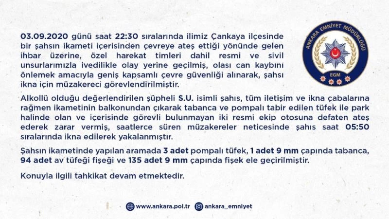 Ankara Emniyet Müdürlüğünden olayla ilgili yapılan açıklamada, “03.09.2020 günü saat 22.30 sıralarında ilimiz Çankaya ilçesinde bir şahsın ikameti içerisinden çevreye ateş ettiği yönünde gelen ihbar üzerine Özel Harekat Timleri 03.09.2020 günü saat 22.30 sıralarında ilimiz Çankaya ilçesinde bir şahsın ikameti içerisinden çevreye ateş ettiği yönünde gelen ihbar üzerine, Özel Harekat Timleri unsurlarımızla ivedilikle olay yerine geçilmiş, olası can kaybını önlemek amacıyla geniş kapsamlı çevre güvenliği alınarak, şahsı ikna için müzakereci görevlendirilmiştir” denildi.