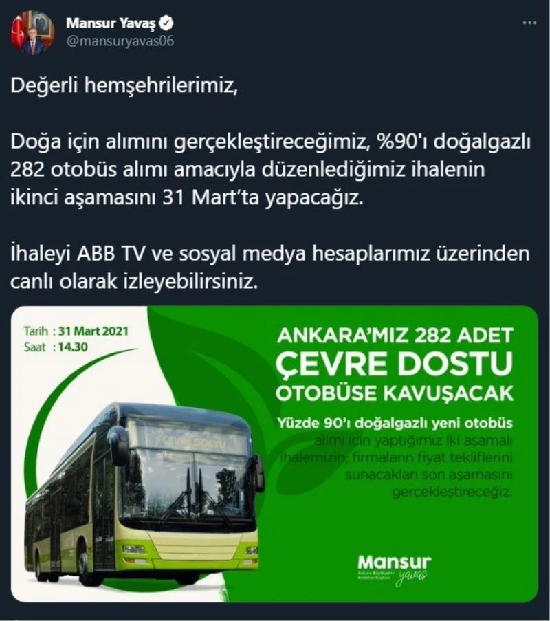 İki aşamalı yapılan ihalenin ilk aşamasında firmaların yeterlilik belgeleri alınırken, firmaların fiyat tekliflerini sunacağı ihalenin ikinci aşamasının gerçekleştirileceği tarihi de Büyükşehir Belediye Başkanı Mansur Yavaş 31 Mart olarak açıkladı. Sosyal medya hesapları üzerinden yaptığı paylaşımla Başkentlileri bilgilendiren Yavaş, “Doğa için alımını gerçekleştireceğimiz, yüzde 90’ı doğalgazlı 282 otobüs alımı amacıyla düzenlediğimiz ihalenin ikinci aşamasını 31 Mart’ta yapacağız. İhaleyi ABB TV ve sosyal medya hesaplarımız üzerinden canlı olarak izleyebilirsiniz” dedi.