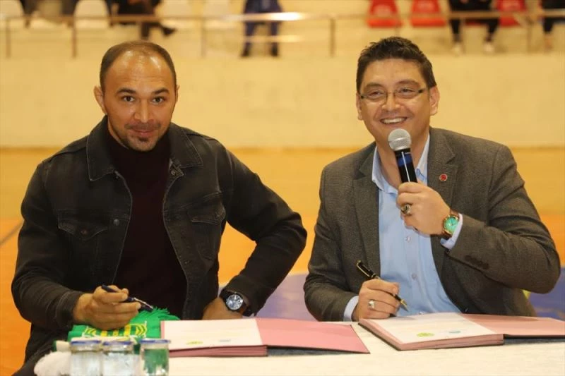 Korkuteli Belediyespor ile anlaşan başpehlivan Ali Gürbüz için Recep Gürbüz Spor Salonu'nda imza töreni düzenlendi.