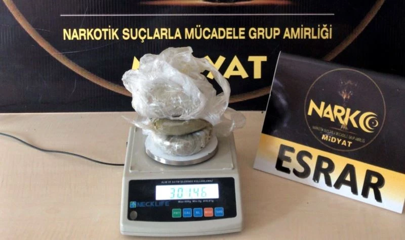 Mardin’in Midyat İlçe Emniyet Müdürlüğüne bağlı Narkotik ekiplerince uygulama noktasında durdurulan şüphelinin üzerinde yapılan aramada 300 gram toz esrar maddesi ele geçirildi.