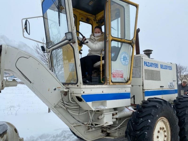 Pazaryeri Belediye Başkanı Zekiye Tekin, ilçelerine yağan yoğun kar yağışı sonrası belediye greyderine binerek kar kürüdü.