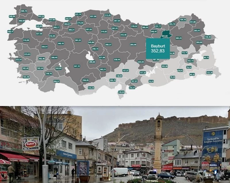 Bakan Koca’nın paylaştığı haritada 24-30 Nisan 2021 tarihli vaka sayısı Bayburt’ta 352,83 olarak yer aldı.
