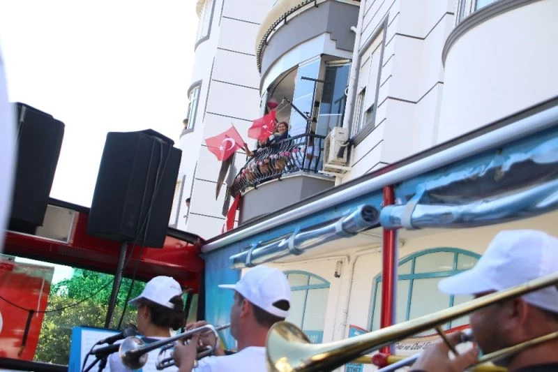 Arife ve bayramın birinci günü kent merkezinin yanı sıra Elmalı, Korkuteli ve Kaş’ta düzenlenen konserler bayramın ikinci ve üçüncü günü Alanya, Gazipaşa, Manavgat, Serik, Demre, Kumluca, Finike ve Kemer’de devam etti. Antalya Büyükşehir Belediye Bando ve Orkestrası, Emre Dayıoğlu ve Orkestrası ile Antalya Yerel Sanatçılar Orkestrası, mobil otobüsler ve kamyon üzerinde ilçeleri mahalle mahalle dolaşarak, çaldıkları şarkılarla vatandaşlara keyifli anlar yaşattı. Evlerinin balkonlarından coşkuya ortak olan vatandaşlar, şarkıları hep bir ağızdan söyleyerek, danslarla müzisyenlere eşlik etti. Antalyalılara bayram sevincini yaşatan orkestra üyeleri alkış yağmuruna tutuldu.