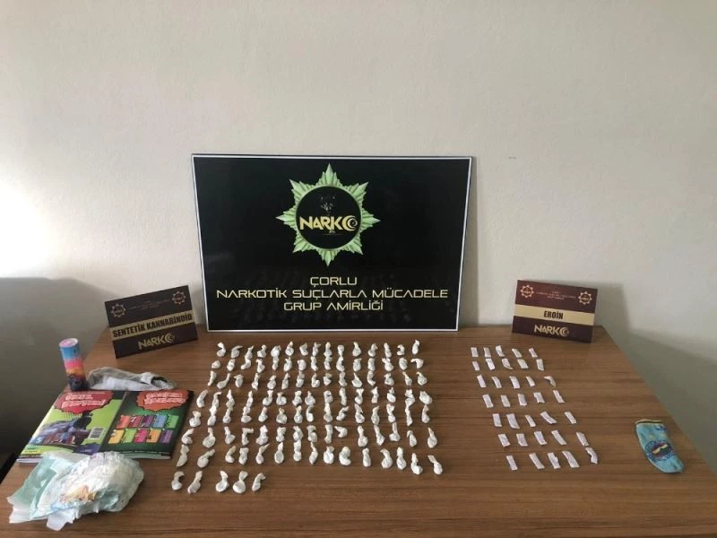 Tekirdağ Narkotik Suçlarla Mücadele Şube Müdürlüğü Çorlu Grup Amirliği görevlilerince Hıdırağa (Kore) Mahallesi’nde uyuşturucu ve uyarıcı madde ticareti yapan şahıslara yönelik operasyon düzenlendi. Yapılan çalışmalar kapsamında narkotik köpeği Larissa ile kullanılmayan tek katlı bir binada arama yapıldı. Larissa’nın bebek bezine tepki vermesi üzerine yapılan aramada, bebek bezine sarılı; fişeklenmiş halde 110 fişek uyuşturucu maddelerden bonzai (Sentetik Kannabinoid) maddesi, fişeklenmiş halde 35 fişek uyuşturucu maddelerden eroin maddesi, uyuşturucu madde fişeklemesinde kullanılan 2 adet defter ve saç tokaları ele geçirildi.