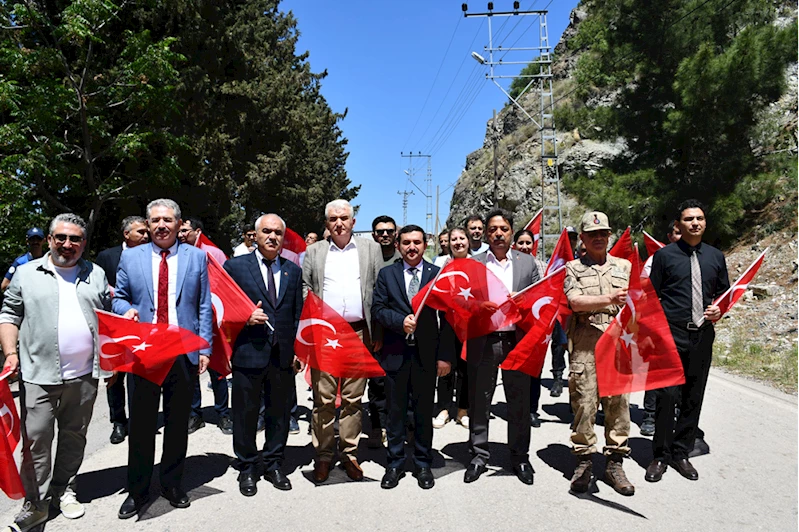 Kaymakam Mahmut Sami Yılmaz ve diğer protokol üyeleri öğrencilerle ellerinde Türk bayrakları ve marşlar söyleyerek Atatürk Anıtı'na kadar yürüdü.