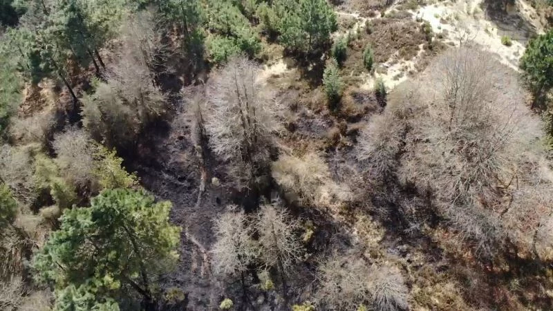 Ormanın bir bölümünde olan ve itfaiye ekipleri tarafından söndürülen yangın dron ile havadan görüntülendi. Polis, yangının çıkış sebebini araştırıyor.
