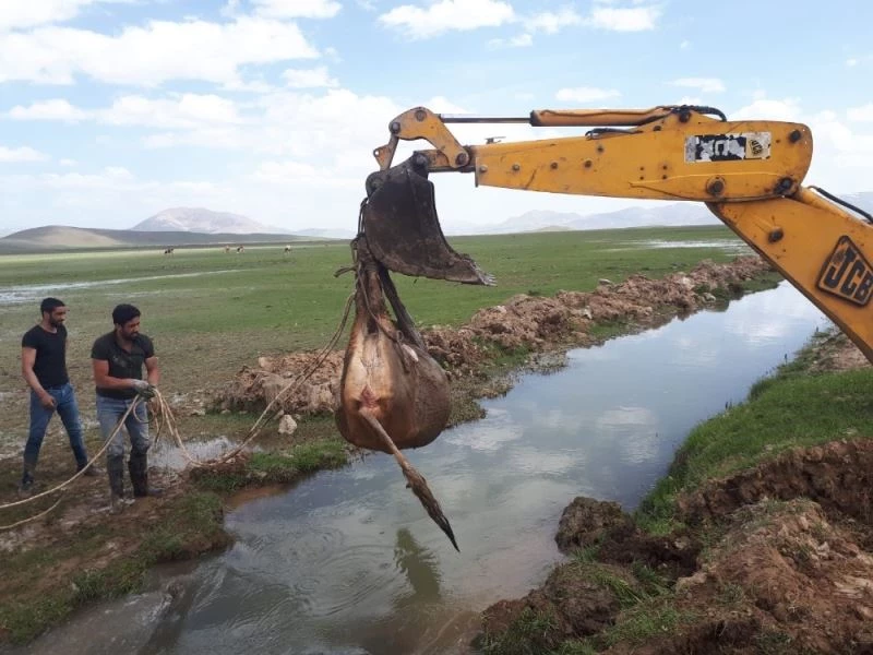 Van’ın Çaldıran ilçesinde merada otlarken düştüğü çayda beli kırılan ineğin imdadına Çaldıran Belediyesi ekipleri yetişti.