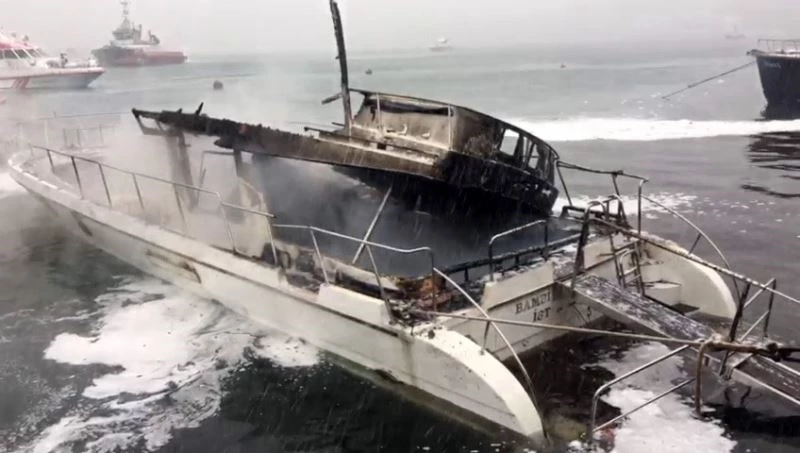Beşiktaş Bebek sahilinde alevler içinde kalan 2 yattan biri tamamen denize batarken, küle dönen diğer yat da batmaya başladı.