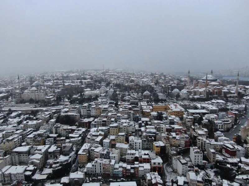 İstanbul’da 2 gündür etkili olan kar yağışı kentin birçok alanını beyaza bürüdü. Etkisini hala sürdüren kar yağışı, Sultanahmet Camii, Ayasofya-i Kebir Cami-i Şerifi ve Topkapı Sarayı’nın üzerini beyaz örtü ile kapladı. Beyaz gelinliğini giyen tarihi yarımada havadan görüntülendi. Beyaz örtü ile kaplanan tarihi yarımada kartpostallık görüntüler oluşturdu. Kar etkisini arttırarak devam ederken, görüş mesafesi de düştü.