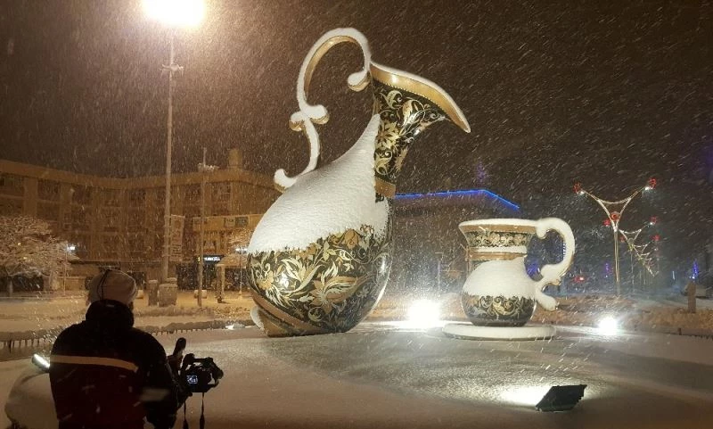 Kar kentte sabahın aydınlanmasına yakın saatlerde adeta kartpostallık görüntüler oluşturdu. Erzincan’ın simgelerinden Dörtyol mevkiinde bulunan bakır sürahiyi kar yağışıyla birlikte çekebilmek için fotoğraf severler adeta akın etti.
