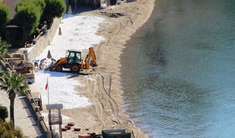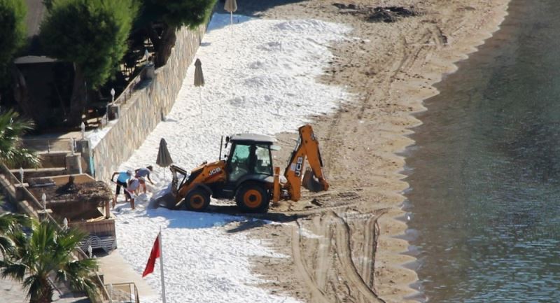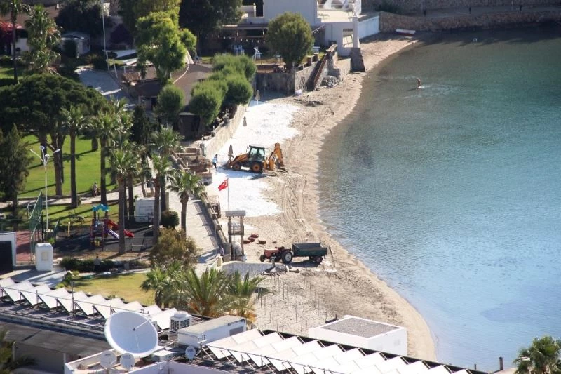 Muğla’nın Bodrum ilçesinde sahile beyaz kum (Kalsit kumu) seren otel Bodrum Belediyesinin uyarılarının ardından kumları sahile sermeden topladı.