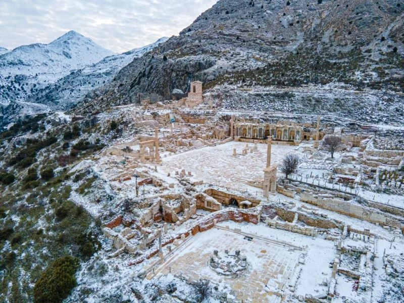 Ağlasun ilçesindeki Akdağ eteklerine kurulu Sagalassos Antik Kenti beyaz gelinliğini giydi. Bin 700 rakımdaki Antoninler Çeşmesi ile Roma Dönemi’nin ihtişamlı ve nitelikli yapılarını barındıran Sagalassos Antik Kenti, ‘aşkların ve imparatorların şehri’ olarak biliniyor. Kar yağışının ardından beyaz örtüyle kaplanan antik kent, drone ile de görüntülendi. Beyaza bürünen antik kentte eşsiz görüntüler ortaya çıktı.