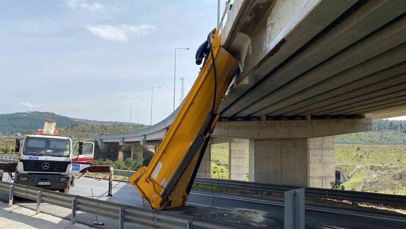 Beykoz’da, Kuzey Marmara otoyolu bağlantı yolunda hafriyat kamyonunun seyir halindeyken açılan dorsesi, viyadüğe çarparak asılı kaldı. Dorsenin bir ucunun yolda, bir ucunun da viyadükte kalacak şekilde askıda kalması ilginç görüntülere sahne oldu. Çarpışmanın etkisiyle dorseden ayrılan kamyon ise 100 metre ilerledikten sonra durabildi.