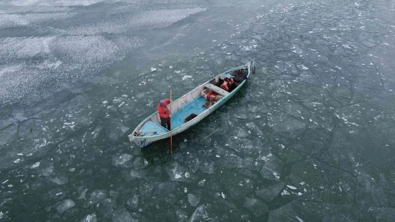 Dondurucu soğuklarda ve buz kütleleri arasından açıklara gidip gelmenin ve avlanmanın zorluklarına da dikkati çeken Yılmaz, “Risk var, tekne delinebilir buzdan böyle havalarda. Oldu da yani birkaç sefer başımıza geldi. Allah korusun ne olacağı belli olmaz. Kış günü tabi. Sis de basabilir, kar yağabilir, şu anda teknoloji geliştiği için cep telefonlarıyla yolumuzu bulabiliyoruz. Eskiden böyle bir şey yoktu, çok sıkıntılıydı. Yine hala akıllı telefon kullanmayanlar da var. Ağlar buza denk gelebilir, parçalanabilir. O yüzden korkumuzdan şu an ağlarımızın yarısını çıkarıyoruz. Gidip geliyoruz avlanmaya ama balık da çok az çıkıyor. Kadife balığı ve 3-5 de sazan var. Ağ serdiğimiz yerler limanımıza yaklaşık 5-6 kilometre mesafede bulunuyor” şeklinde konuştu.