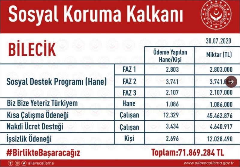 İl Başkanı Karabıyık, yaptığı açıklamada Korona virüs (Covit-19) salgını sosyal koruma kalkanı çerçevesinde Bilecik’e 71 milyon 869 bin 284 lira kaynak aktarıldığını belirtti. Karabıyık,"Cumhurbaşkanımız Recep Tayyip Erdoğan’ın ve Bakanımız Zehra Zümrüt Selçuk’un talimatlarıyla ilimiz ve Türkiye genelindeki Sosyal Koruma Kalkanı verileri. Salgın boyunca 71 milyon 869 bin 284 TL kaynağı ilimize aktaran hükümetimiz pandemiden etkilenen hemşehrilerimizin yanında olmaya devam ediyor" dedi.