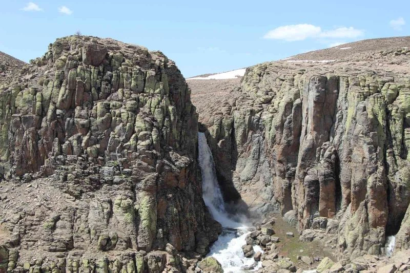 Bingöl’de yaz aylarında kuruyan, kış aylarında soğuklar nedeniyle donan 50 metrelik Çır Şelalesi, bahar aylarında karların erimesiyle coştu.