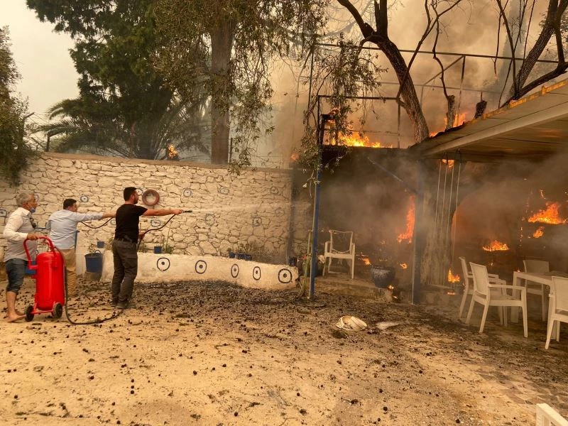 Muğla’nın Bodrum ilçesi Mazı Mahallesi sakinleri güvenli bölgelere tahliye edilirken, alevler evlere sıçradı. Mahalleliler çaresizce evlere sıçrayan yangını söndürmek için uğraş veriyor.