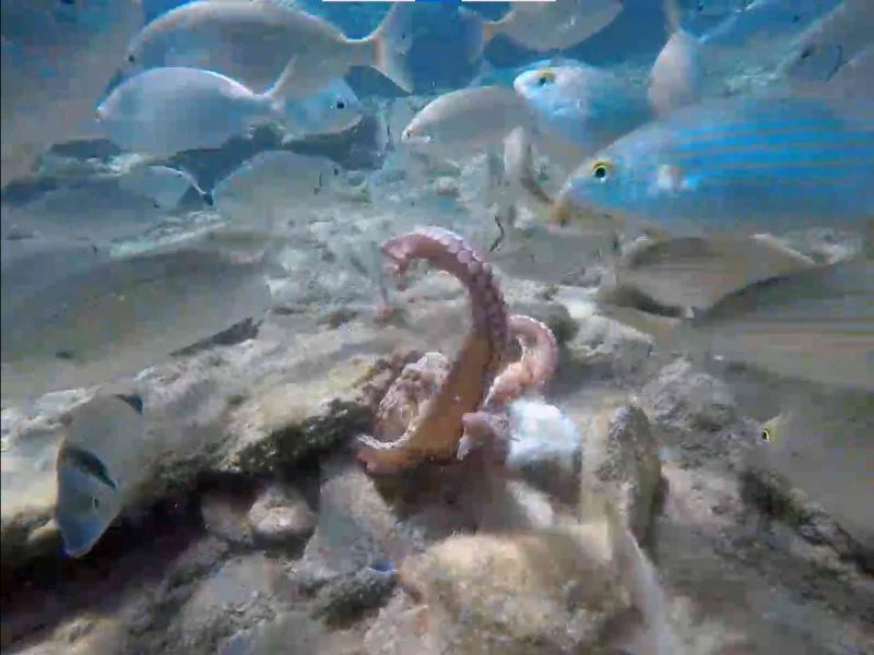 Ahtapot Kerim Can’ın üç ayrı yuvasını bulunduğunu, her gün dalış yaparak kendisine ziyaret ettiğini ve beslediğini belirten dalış eğitmeni Egemen Özer, son dalışında balıklara öfkelenen ahtapot Kerim Can’ın sarpa ve melanurlara karşı kendisini korumak için yumruk attığı anları videoya çekti.