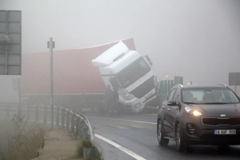 Kaza, saat 10.30 sıralarında D-100 karayolu Bolu Dağı geçişinin Karanlıkdere mevkiinde meydana geldi. Edinilen bilgiye göre, İstanbul istikametine seyir halinde olan Lütfi Mercimek idaresindeki 31 AAZ 75 tır, görüş mesafesi 20 metreye kadar düşen yolda kontrolden çıkarak refüjde bulunan beton bariyerlerin üzerine çıktı. Kazada sürücü yara almadan kurtulurken yaklaşık 1 metrelik beton bariyerin üzerine çıkan tır asılı şekilde kaldı.