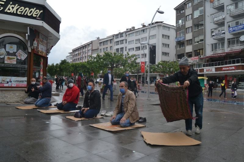 Bolu’da, korona virüs nedeniyle ibadete kapatılan camilerde 74 gün sonra ilk kez camilerde cemaatle namaz kılındı. Seccadeleri olmayan vatandaşlar ise yağmurlu havaya rağmen dışarıda namaz kıldı.