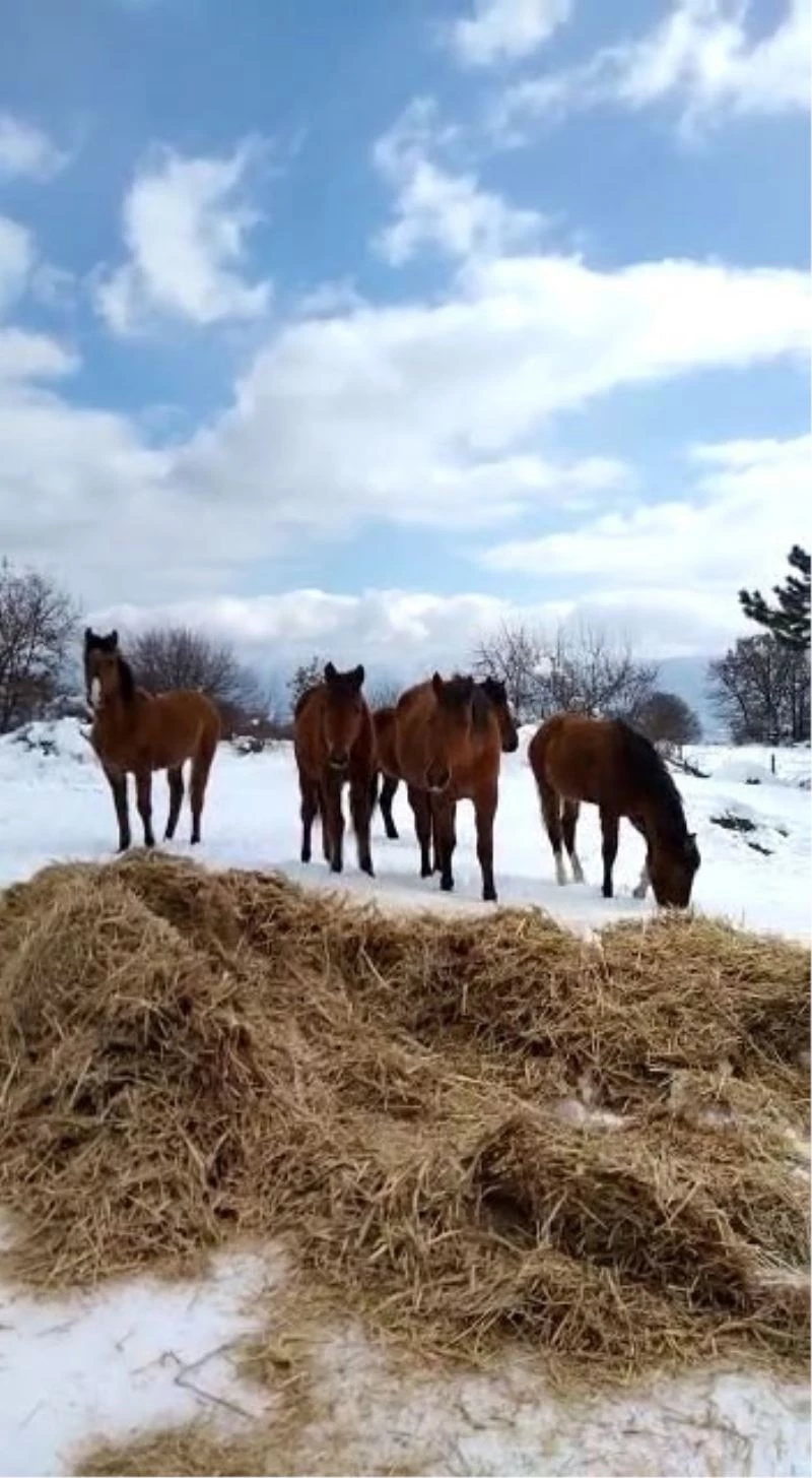 Bolu’da kar kalınlığının 1 metreye yaklaştığı ormanlık alanlarda aç kalan yılkı atları için yemleme çalışması yapıldı.