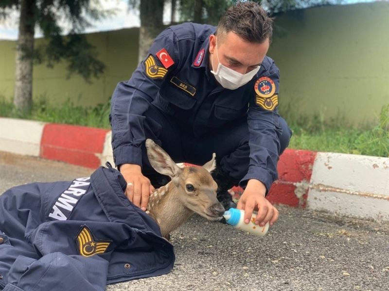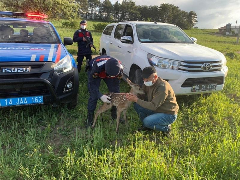 Bolu’da, jandarma ekipleri, Yukarıkınık köyünde bitkin halde buldukları yavru geyiği, biberonla besledikten sonra Doğa Koruma ve Milli Parklar Müdürlüğü ekiplerine teslim etti.