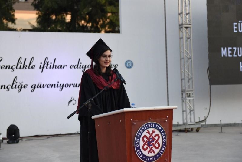 Ege Üniversitesi Tıp Fakültesi, bu yıl pandemi gölgesinde 60. dönem mezunlarını törenle uğurladı. 419 hekimin mezun olduğu törenin yıldızı ise İzmir Kent Hastanesi Kardiyoloji Uzmanı Doç. Dr. Abdi Sağcan’ın kızı Şule Yıldız oldu. Ege Üniversitesi Tıp Fakültesinin 1988 mezunu olan, aynı fakültede 1994’te dahiliye, Türkiye üçüncüsü olarak kazandığı kardiyoloji ihtisasını da 1997’de tamamlayan Doç. Dr. Sağcan, kızına örnek oldu. Nitekim, öğrencilik hayatı başarılarla geçen, TÜBİTAK’tan matematik ve kimya dallarında Türkiye dereceleri bulunan Şule Yıldız Sağcan babasının izinden gitti, meslek olarak hekimliği seçti. Üniversite sınavını ilk 50 içinde kazanıp yine babasının okuduğu fakülte olarak EÜ Tıp Fakültesini tercih eden Şule Yıldız, birincilikle girdiği fakültesinin her sınıfını birincilikle geçip mezuniyetini de fakülte birinciliğiyle taçlandırdı. Bu başarılarıyla fakülte tarihinde ilginç bir rekorun sahibi olan genç doktor, birincilik plaketini ve ödülünü Fakülte Dekanı Prof. Dr. Cemil Gürgün’ün elinden aldı. Dr. Sağcan babası gibi dahili bilimlerde ihtisas yapmayı hedeflerken, törendeki konuşmasında verdiği mesajlarla gönüllere dokundu. Tıbbiyeli ruhunu hatırlatıp, pandemi döneminde yaşamını yitiren meslek büyüklerini anan Dr. Sağcan, hekimliğin en önemli sorumluluğunun vicdani sorumluluk olduğunu söyledi. Dr. Sağcan tören sonrasında mutluluğunu annesi Gonca, babası Doç. Dr. Abdi Sağcan ve ağabeyi Hüsnü Barış ile paylaştı.