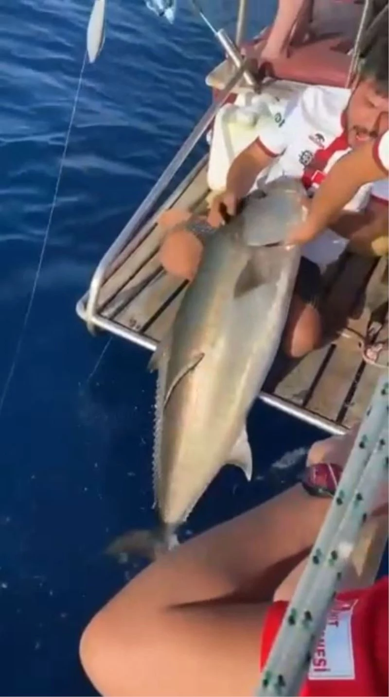 Antalya’da tekneyle balık avına çıkan genç, oltayla 42 kiloluk akya balığı yakaladı. Misinayı çekerken ‘Oha, rekor’ diyerek heyecanlanan genç, tekneye aldığı balığı kaldırıp öptü.