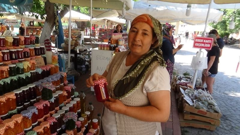 Bademli domates ve gelincik çiçeğinin en çok ilgi gören reçeller olduğunu dile getiren Evren, “Kadınlarda yüz gözeneklerini kapatma özelliği var. Ayrıca kansızlığa, kemik erimesine karşı çok faydalı” şeklinde konuştu.