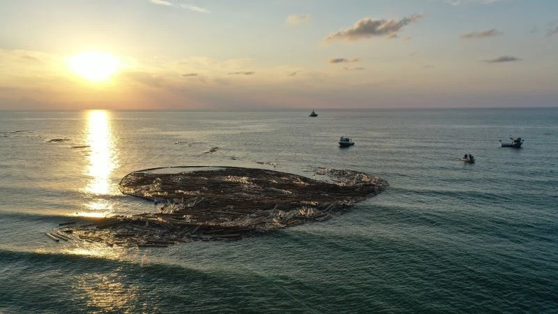 Açıklamada, deniz yüzeyinde bulunan tomrukların toplanmasının, özel bir firma tarafından İstanbul’da imal edilen çelik tellerden oluşan, 120 metre boyunda ve 3.5 metre derinliğinde, 40 santimetre göz açıklığı bulunan, klemens kilit ile örülen, yüzey kısmında batmaması için mantar ve polietilen kafes borusu ile desteklenen, dünyada ilk defa kullanılan bir sistem ile ilk kez böyle bir çalışmanın gerçekleştirildiği aktarıldı.