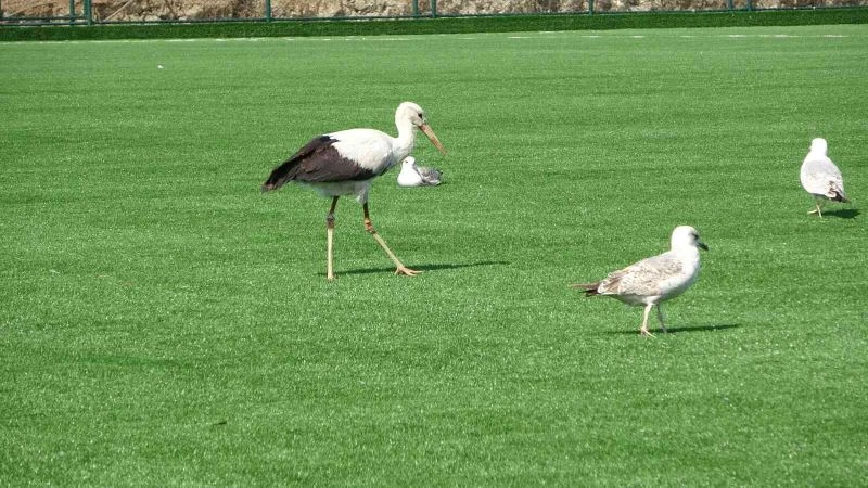 Bu leylek futbol sahasında martıların arasında dinlenmeyi yeğledi